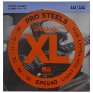 Electric Guitar Stringing, Soft Top/Hard Bottom, 10-52, Highly Magnetic Corrosion-Resistant Alloy Steel, Super Bright Tone With No Shrill Overtones, Harmonically Rich, Brilliantly Penetrating Highs Combined With Pronounced, Tight, Hard Lows, Resistance To Vibration corrosion.