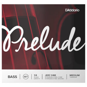 Juego de cuerdas para contrabajo, serie Prelude de D’Addario, escala 1/3, tensión media, aptas para contrabajos de 1/4 con una longitud de 35 1/2” pulgadas (900mm), núcleo de acero multitrenzado, calidad de tono cálido, buena respuesta del arco, ideales para utilizar en entornos educativos, sonido claro y cálido que se combina bien en todo el encordado, paquete ecológico y resistente a la corrosión para conservar la frescura de las cuerdas.