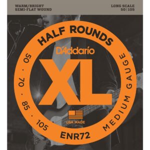 Juego de cuerdas para bajo de 4 cuerdas, tensión media, calibre 50-105, escala larga, proceso exclusivo de fabricación ”Half Round” (semicircular), apto para bajos de escala larga con una longitud de escala de la cuerda de hasta 36 1/4” pulgadas, paquete ecológico y resistente a la corrosión para conservar la frescura de las cuerdas.