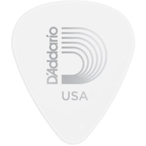Paquete de 25 púas de celuloide color blanco para guitarra, calibre medio (0.70mm), funciona bien para rasgueo y uso de púa articulado, sensación natural al tacto y un tono cálido y grueso, forma estándar que permite tocar con comodidad.