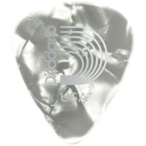 Paqquete de 25 púas celuloide en blanco aperlado para guitarra, calibre liviano(0.50 mm), ideal para rasgueo, sensación natural al tacto, tono cálido y grueso,forma estándar que permite tocar con comodidad.