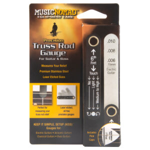 Gauge set including 3 relief sizes (.006”, .008”, .010”) for electric, acoustic, classical and bass guitar, made of stainless steel, high precision, without the annoying and messy oil found in From traditional gauge sets, laser-engraved sizes (inches and millimeters) and non-dislodge instrument type, easy-to-follow instructions printed on the handle, and an innovative tab to help, this gauge is part of our KKEP IT SIMPLE SETUP method. (KISS) using our precision gauges and tool sets.