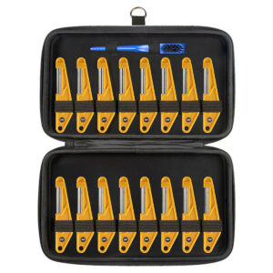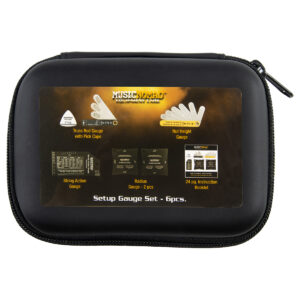 6-Piece Gauge Kit for an excellent setup process with innovative, high-quality gauges, includes web gauge that features the three most common web relief measurements (.006”, .008”, .010”) for electric, acoustic, and bass guitars, plus innovative capo, string action gauge with precise, easy-to-read measurements (inches, metric, and 64ths): 7.25”, 9.5”, 10”, 12”, 14”, 15” , 16”, 20”. Nut Height Gauge with the three most common nut height measurements (.016”, .018”, .020”) plus three additional sizes (.012”, .014”, .022”), plus a 24-page instruction booklet and a carrying case.