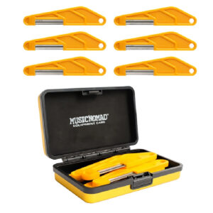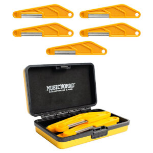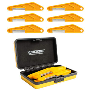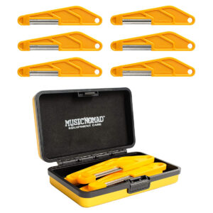 Electric Guitar File Set for Medium Strings (.013”, .017”, .024”, .032”, .042”, .056”) Industrial Strength Diamond Coated, Comes in Compact Aluminum Case, 3” x 6” x 1.4” strong, lightweight, innovative rope-shaped round blade design that won't bend, resulting in smooth, precise cuts, laser-engraved size on each blade plus ergonomic handle and convenient hole to hang on the workbench, perfect for simultaneously cutting and grinding new or existing nut slots, ideal for all common nut materials like nylon, bone, graphite and TUSQ, they even work great in saddles.