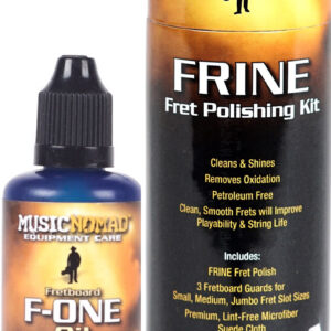 Fret Care Kit, Cleans, Conditions and Protects All Unfinished Fingerboards, F-ONE Contains Natural 100% Oils and Contains No Lemon Oil, Petroleum or Wax, FRINET Fret Polish is a Revolutionary Petroleum-Free Formula Designed to Clean and Polish All Frets the frets safely and quickly, the 3 GRIP fingerboard guards with an innovative handle keep your hands from getting in the way and curved angle contours designed for all fingerboards, one of each for all fret slot sizes small, medium and jumbo, chamois fiber cloth specially designed to work with our FRINE fret polish and can be washed in a washing machine.