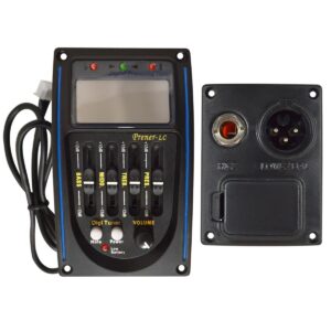 Pastilla para guitarra acústica, EQ de 4 bandas y afinador LCD, impedancia de entrada: 2.2 milo-ohms, respuesta de frecuencia: 20 Hz – 200 kHz, graves, medios, agudos y presencia, funciona con pila de 9V, modo auto y afinación manual, afinación cromática, pastilla pieza de cerámica, caja de batería XLR combo.