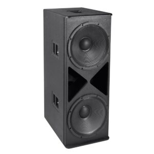 Bafle pasivo con dos woofers de 15” pulgadas, potencia RMS: 800 watts, programa:1600 watts, pico: 3200 watts, SPL continuo: 130 dB, programa: 133 dB, pico: 136dB, cobertura 90°x 60°.