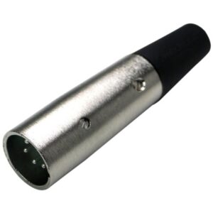 Silver 4-pin male XLR connector, nickel-plated finish.
