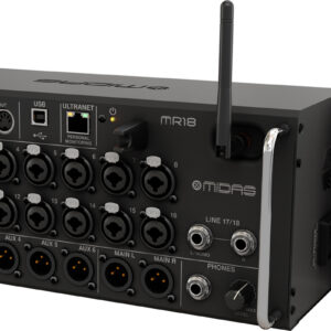 Mezcladora digital de 18 entradas, ideal para aplicaciones en vivo y en estudio, para tablets iPad/Android con 16 preamps Midas Pro, módulo Wifi integrado, interface de audio multicanal bidireccional USB 2.0 de 18×18, enrutador Wifi integrado tri-modo para operación directa sin necesidad de routers externos, auto mezcla destilo Dugan que gestiona automáticamente el gain sharing del micrófono, 4 procesadores de efectos digitales de procesamiento de señales, conectividad ULTRANET para sistemas de monitoreo personal P-16, incluye rack ears y bumpers de protección para aplicaciones flexibles de rack y en escenario, 6 auxiliares y buses main LR con insertos, procesamiento de dinámica completa y ecualizador paramétrico de 6 bandas o ecualizador gráfico de 31 bandas, 6 salidas auxiliares XLR y 2 salidas main XLR más conector de audífonos, procesamiento de señal digital de punto flotante de 40 bits, aplicaciones disponibles de iOS, Android y PC/Mac/Linux para operación remota por medio de Ethernet, LAN o Wifi, MIDI I/O que permite controlar la mezcladora a través de un equipo MIDI o para usarla como interfaz USB MIDI, futuras actualizaciones de firmware que incluyen nuevos plugins de FX descargables de forma gratuita desde la página de midasconsoles.com, dimensiones: 333 x 149 x 140 mm, peso: 3.9 kg.