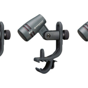 E604 3-piece microphone set, compact dynamic microphone, ideal for toms and snare drums, transmits extreme sound pressure levels (over 160 dB) without distortion, impact-resistant fiberglass reinforced housing, very low structural noise, extremely easy handling and free positioning, compensation coil, dimensions: Ø 33 x 59 mm, XLR-3 connector, frequency response: 40 – 18,000 Hz, transducer principle: dynamic, weight: 60 g, cardioid polar pattern, open field sensitivity, no load, (1kHz): 1.8 mV/Pa, nominal impedance: 350 ohms, minimum termination impedance: 1000 ohms, includes drum clip and carrying bag.