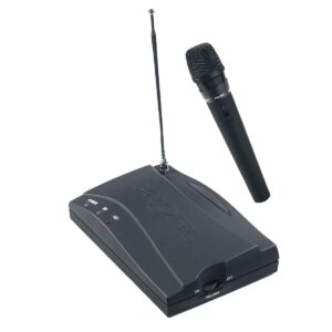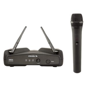 Micrófono inalámbrico Proel. Modelo: WM100KIT. Sistema de microfonía inalámbricaVHF. Rango de frecuencia: 175 – 216 MHz. Hasta 30 m de alcance. Respuesta de frecuencia: 50 Hz – 15 kHz. Rango dinámico: 95 dB. Receptor de sobremesa de perfilbajo con 2 antenas plegables. Se pueden usar hasta 5 sistemas en la misma ubicación. Estuche de almacenaje y transporte en ABS. Rango de radiofrecuencia: 174 -216 MHz VHF.