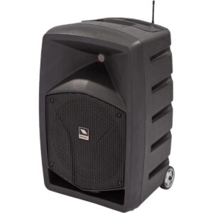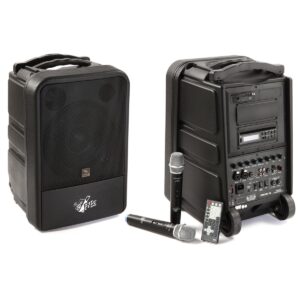 Sistema portátil con módulo inalámbrico UHF PLL wireless module (863-865 MHz) con IR SYNC y micrófono de mano, puerto USB, ranura para SD y conexión bluetooth,display LCD y control remoto, amplificador de 120 watts, woofer de 10” y driverde 1”, funcionamiento de hasta 3 o 4 horas con pila de 12V, gabinete compacto yligero, 2 ruedas y manija retráctil, compartimento para 2 micrófonos inalámbricos.