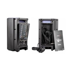 Sistema de altavoces Proel portátil con reproductor CD/DVD/MP3, puerto USB y sistema de micrófono inalámbrico UHF incluido. Conectores de entrada: Combo (entrada de micrófono), 2 x RCA + mini-jack (entrada de línea estéreo). Salidas: Salidade línea estéreo (2 x RCA), salida de video (RCA). Sensibilidad: 95 dB. Potencia: RMS Continuo: 100 watts, máxima: 180 watts. Respuesta de frecuencia: 50 Hz -18 kHz, – 3 dB.