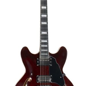 Guitarra eléctrica Mars Hollowbody 339 Satin con cuerpo de contrachapado de caoba y acabado en chapa de caoba. Mástil de caoba moderno tipo C y diapasón de palisandro para una ejecución cómoda. Equipado con 2 humbuckers cerámicos, puente stop bar tail y controles de volumen y tono. Disponible en colores violin sunburst (VIS) y tobaco sunburst (TOS), combinando potencia y elegancia en un diseño robusto.