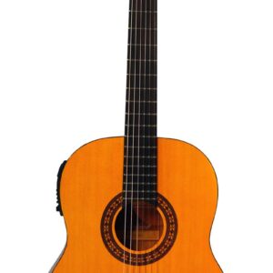 Guitarra electro acústica con caja clásica, canto delgado, resaque, tapa de abeto, brazo de nato, aros y fondo de lacewood, diapasón de rosewood, puente de sonokeling, color natural, preamp activo KLT-34 con afinador digital, ecualizador de4 bandas, volumen y fase, cuerdas D’Addario de nylon.