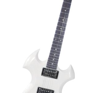 Flying V electric guitar, basswood body, maple neck, rosewood fingerboard, 2 powerful humbuckers, 1 volume and 1 tone, 3-position selector, 22 frets, black halfmoon diecast machinery, vintage tremolo lever.