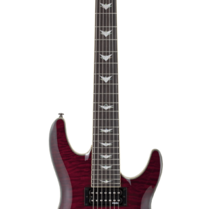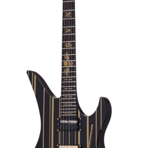 Guitarra eléctrica sólida, cuerpo de caoba, tapa arqueada, unión negro multicapa, brazo de 3 piezas de maple, diapasón de ébano, incrustaciones: Platinum ‘Tempest’, escala: 25.5” (648 mm), 24 trastes x-jumbo, radio del diapasón: 14” (355 mm), forma del brazo: C delgado, espesor en el primer traste: .787” (20 mm) y en el traste 12: .866” (22 mm), cejuela de Graph Tech XL Black Tusq de 1.653” (42 mm) de ancho, alma de 2 vías ajustable con tuerca Allen de 5/32” (4 mm), pastilla del puente: EMG 57, pastilla del brazo: EMG 66, controles: 2 volúmenes y 1 tono con selector de 3 posiciones, compartimento de la batería: 9V, hardware negro, puente: TonePros T3BT TOM con string thru body, maquinaria Schecter Locking, perillas de metal moleteado con tornillo de ajuste, construcción Set-Neck con Ultra Access.
