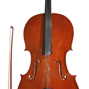 Violonchelo de 4/4, tapa de abeto sólido (laminado), aros y fondo de maple sólido (laminado), brazo de maple sólido, diapasón de ébano, clavijas de maple teñido, filetes incrustados, puente de maple, incluye arco de fibra de vidrio con crin de caballo y funda de nylon.