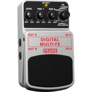 Pedal multiefectos digitales estéreo, efectos alta resolución de 24 bits que incluyen Flanger, Chorus, Phaser, Delay, Tremolo y Pitch Shifter, comparable a losprocesadores de estudio de vanguardia, 2 controles adicionales de parámetros para ajustar delay time, flanger rate, entre otros, LED de estado para activar y desactivar el efecto y checar la batería, funciona con una pila de 9V o con un adaptador PSU-SB DC de Behringer (no incluido), interruptor On/Off de primer nivelpara una mayor integridad de la señal en modo bypass, dimensiones: 54 x 70 x 123mm, peso: 0.33 kg.