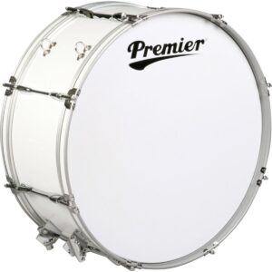 Premier Tenor Bass Drum, Olympic Series, 28" x 12", Made of Ditilwood, Finished with White PVC Mica, Silver Powder Coated Hoops with PVC Inlays, Single-Ply Smooth Heads, Includes One Pair of Sticks, Harness aluminum, weight: 9.6 kg.