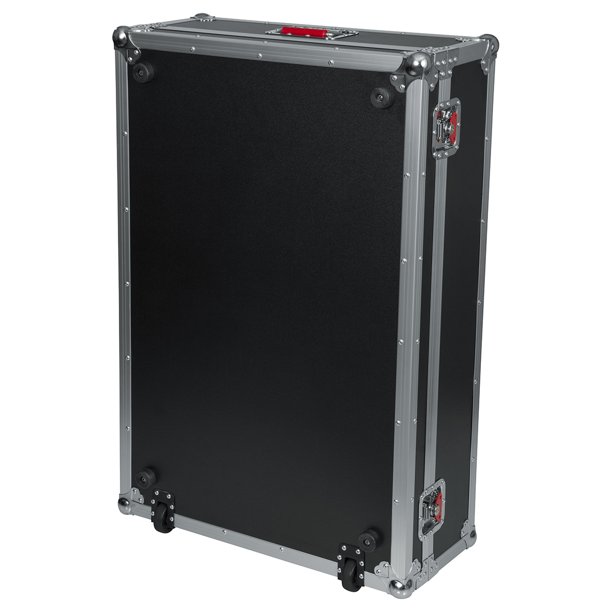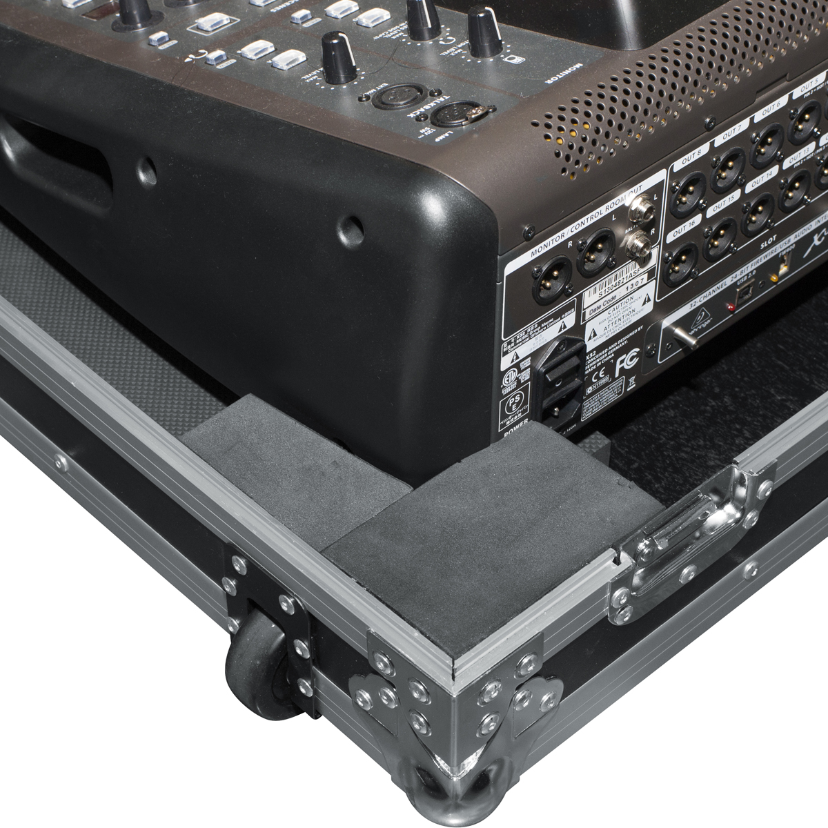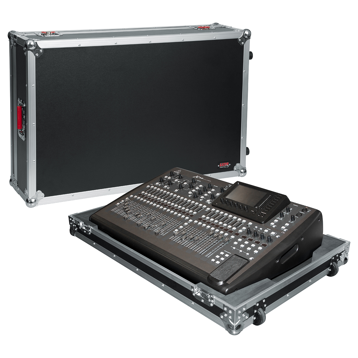 Estuche ATA para mezcladora X32 de gran formato de Behringer, fabricado con madera contrachapada de 9 mm con exterior protector laminado, interior laminado negro con bloques de espuma EVA para protección que dejan espacio para la parte del ventilador en la parte inferior, hardware de grado comercial, cierres bloqueables y cierre grande rojo Signature Gator, manijas de goma con resorte, esquinas protectoras de bola, ruedas incorporadas y asa de remolque.