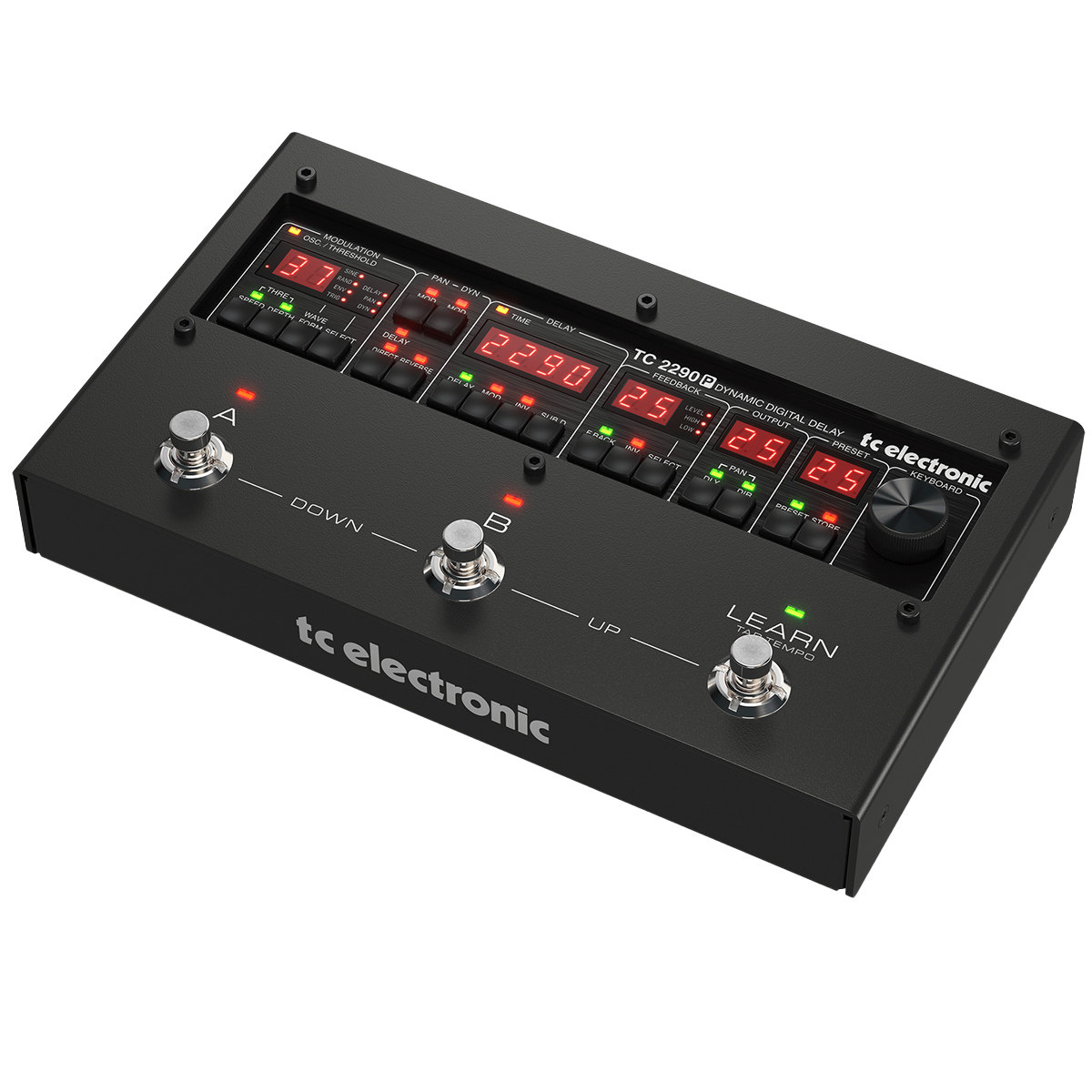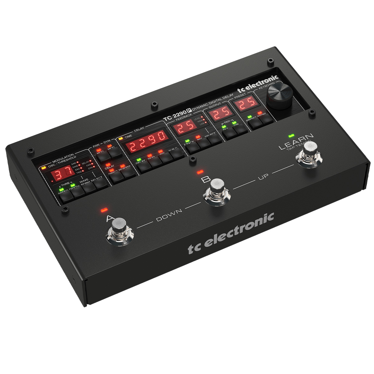 El 2290 P Dynamic Digital Delay es una fiel recreación del legendario TC2290 en forma de un pedal de guitarra compacto. Ofrece una solución completa de delay con amplias capacidades de modulación y panoramización, todo ello con un estética retro que incluye pantallas digitales clásicas y teclas para controlar los parámetros. Con su ”perilla de marcación rápida”, proporciona acceso rápido para editar parámetros sobre la marcha, y cuenta con un inserto de efectos FX para añadir efectos externos a las repeticiones del delay. Con tres interruptores de pie para presets A/B, cambio de banco arriba/abajo y un ”Learn” dedicado para tempo de tap. Incluye una completa funcionalidad de tempo de tap con una amplia selección de opciones de subdivisión, control preestablecido/banco/global y soporte para sincronización con reloj MIDI. Puede almacenar y recuperar hasta 128 presets y ofrece acceso a una biblioteca de presets de algunos de los mejores artistas y productores de la historia de la música a través de la aplicación de escritorio dedicada al 2290. También incluye funciones MIDI IN, MIDI OUT/THRU y mapeo MIDI a través de la aplicación de escritorio 2290. Con opciones de bypass verdadero o bufferizado para activar/desactivar los trails, y un fácil acceso a funciones especiales que antes estaban ocultas en el original TC2290.