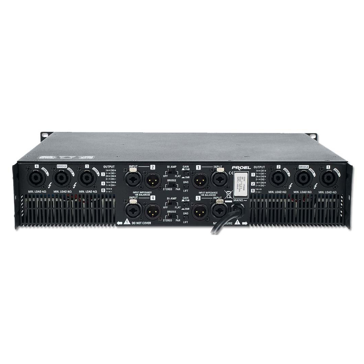 La nueva serie de amplificadores HP-D de Proel emplean módulos de amplificación digital basados en una versión mejorada de la tecnología PWM. La topología innovadora del circuito de amplificación y el empleo de una frecuencia de muestreo muy elevada garantizan un alto rendimiento en todo el rango de audio, mientras que los semiconductores de última generación y la innovadora señal de reconstrucción de filtro garantizan una excelente calidad del audio. Amplificador de potencia Proel de 4 canales clase D. Cuenta con 4 entradas combo y XLR macho con control de volumen por canal, 6 conectores SpeakON para altavoces. Sensibilidad de entrada/impedancia: 0dB/775mV/20K balanceada. Respuesta de frecuencia: 20 Hz – 20 kHz. Relación señal a ruido: > 105 dB. Distorsión armónica total: Menos del 0,5% a 1 kHz a 1/3 de potencia nominal. Ventilación forzada variable en función de la temperatura. Alimentación 117 – 240 V. Dimensiones: 483 x 383 x 88 mm. Montaje en dos unidades de rack. Peso: 11 Kg.