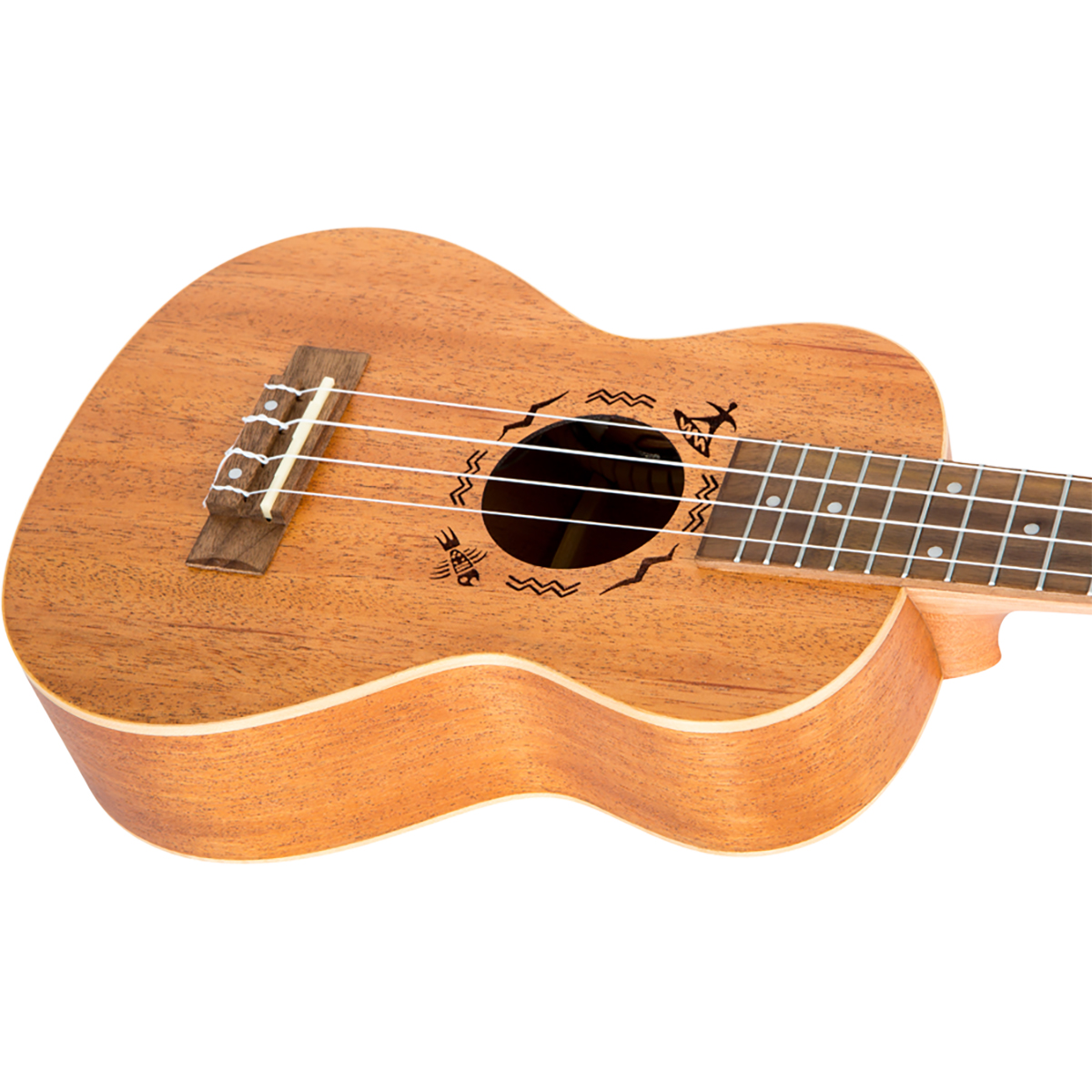 Cejuela de hueso y puente de nogal. La cejuela puede ser un componente pequeño, pero determina el tono del sonido. La cejuela y la montura de este ukelele están hechos de hueso (no de plástico). Sólo uno de los detalles que hacen que este ukelele sea realmente especial.