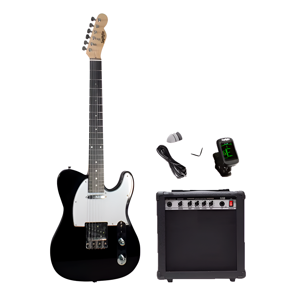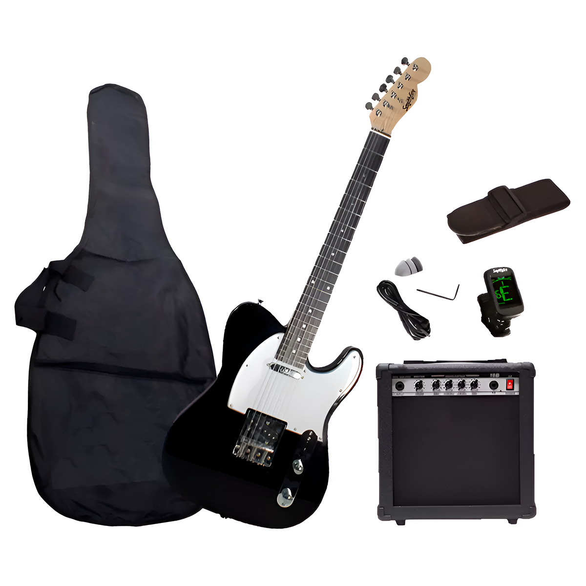 Combo de 15 watts, funda, tahalí, cable, púas y afinador digital.