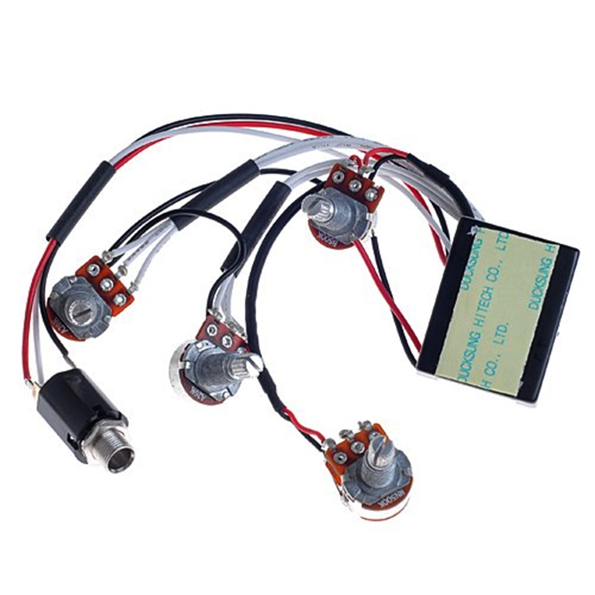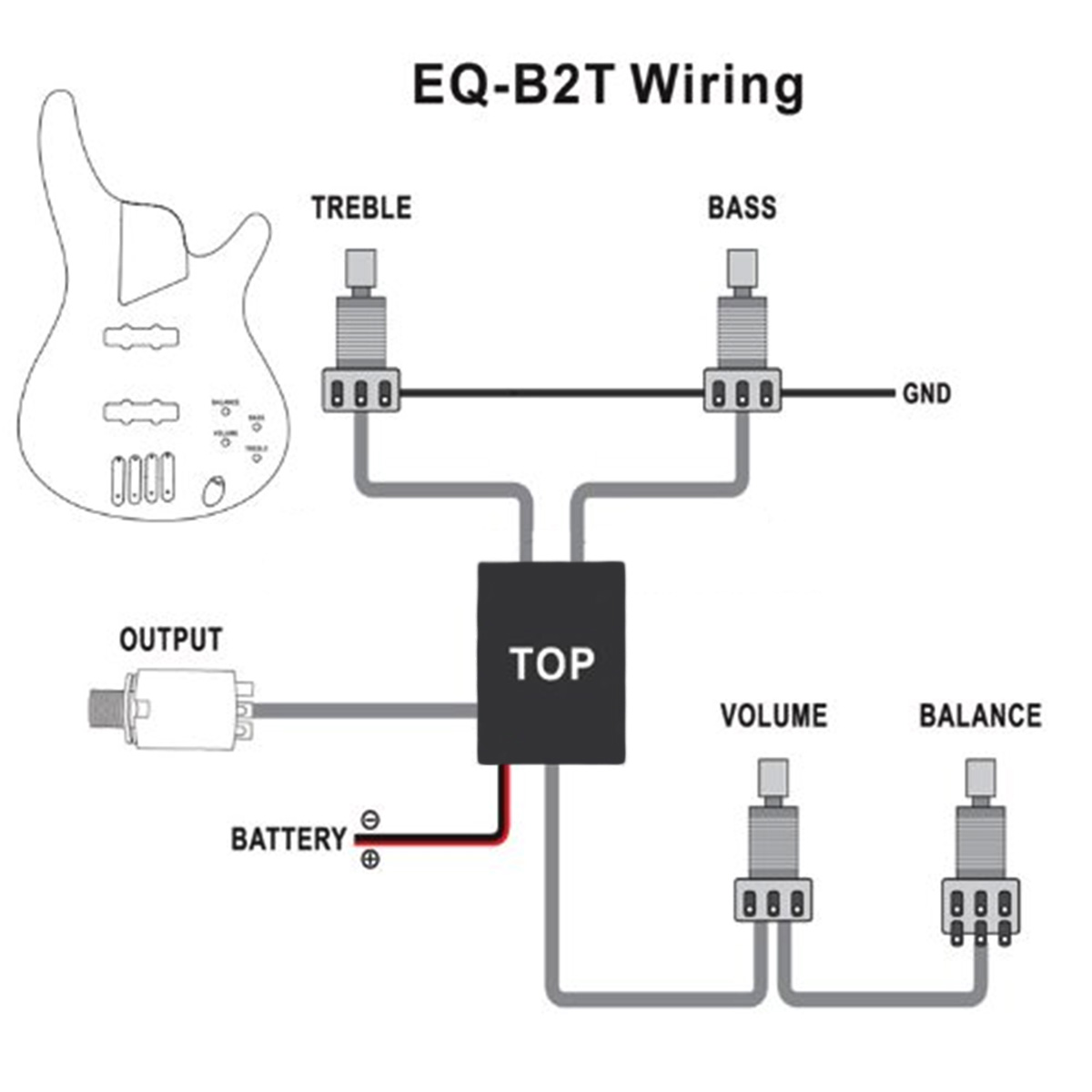 Circuito activo para bajo, 1 control de volumen y 2 de tono con balance de volumen, volumen master, graves: ±12 dB a 85 Hz, agudos: ±12 dB a 7 kHz, jack de salida.