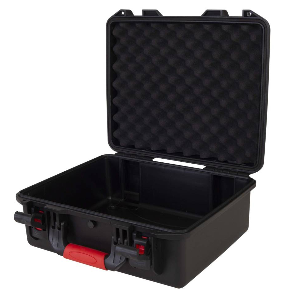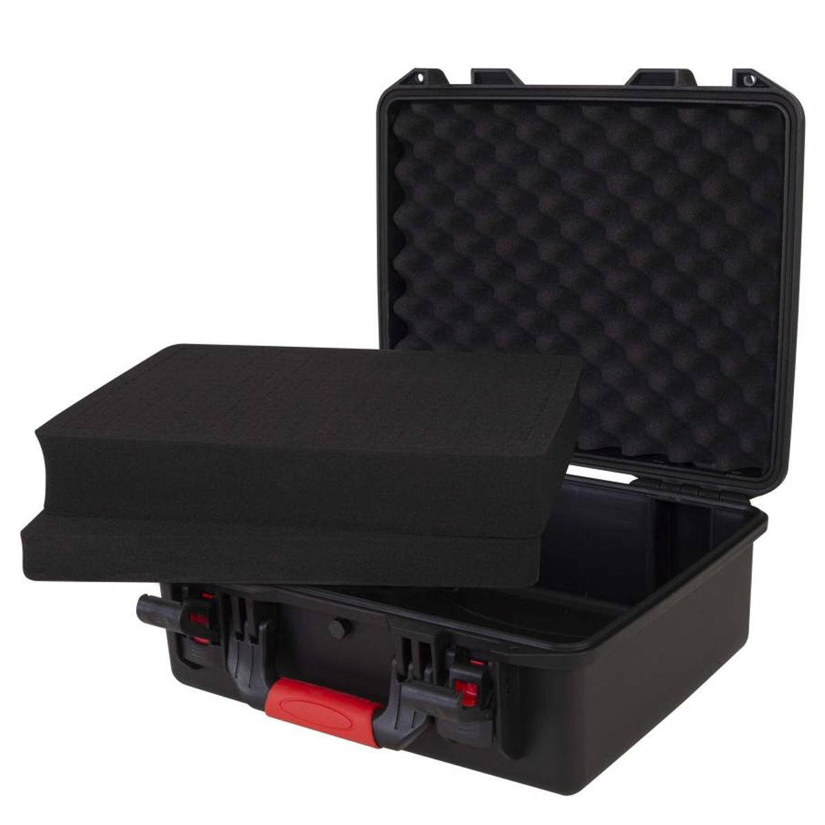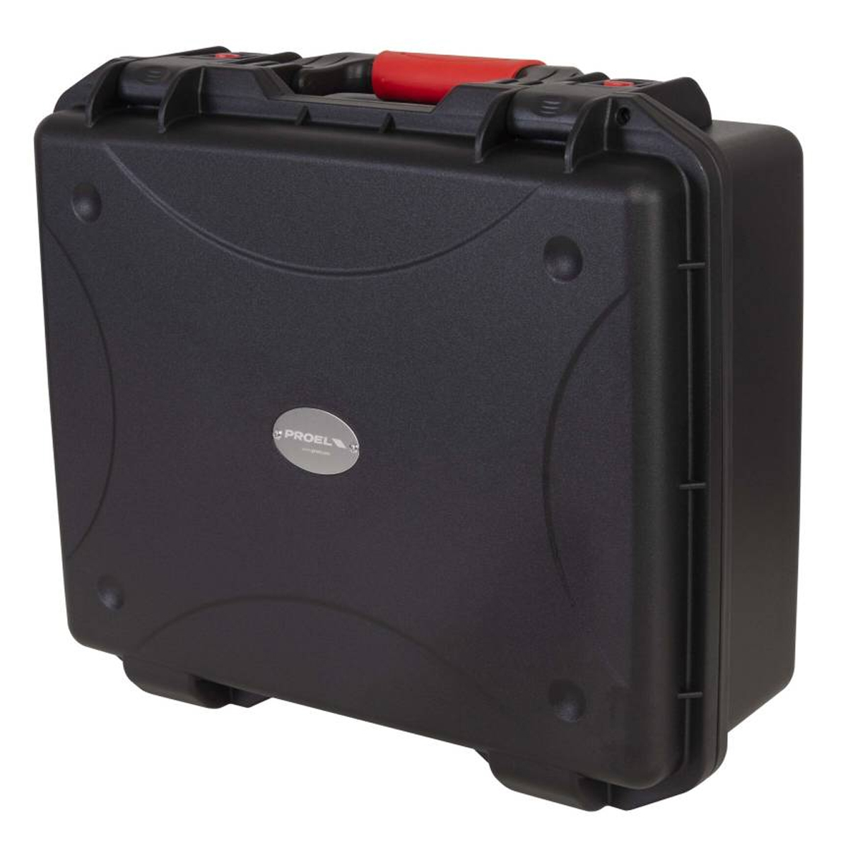 Estuche de polipropileno moldeado por inyección Dimensiones externas: Anchura 465 mm x Profundidad 400 mm x Altura 190 mm / Dimensiones internas: Anchura 430 mm x Profundidad 340 mm x Altura 175 (130 + 45) mm. Color negro.