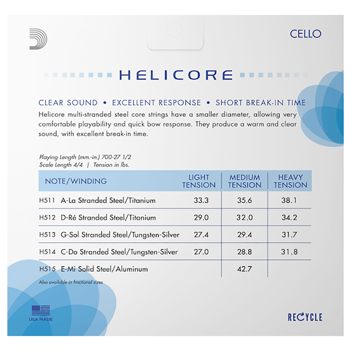 Aptas para violonchelos de 4/4 con una longitud de 27 1/2 pulgadas (700 mm), estas cuerdas de tensión media están optimizadas para satisfacer las necesidades de la mayoría de los músicos. Las cuerdas para violonchelo Helicore están fabricadas con un núcleo de acero multitrenzado, que brinda facilidad de uso óptima mientras produce un tono nítido y cálido. El diámetro más pequeño de la cuerda permite una respuesta rápida del arco. Materiales de máxima calidad combinados con mano de obra especializada producen cuerdas reconocidas por su excelente estabilidad de tono y durabilidad. D’Addario es la marca de cuerdas para instrumento más vendida del mundo. Sus productos son el resultado de más de un siglo de investigación y desarrollo y son instaladas como equipo de serie en las mejores marcas de instrumentos. La pureza de sus materiales y la maquinaria de alta tecnología empleadas en la fabricación de sus productos hacen de D’Addario la marca preferida por los músicos más relevantes de la actualidad. Todas las encordaduras D’Addario vienen en empaques sellados con un gas especial que previene la corrosión y son amigables con el medio ambiente.