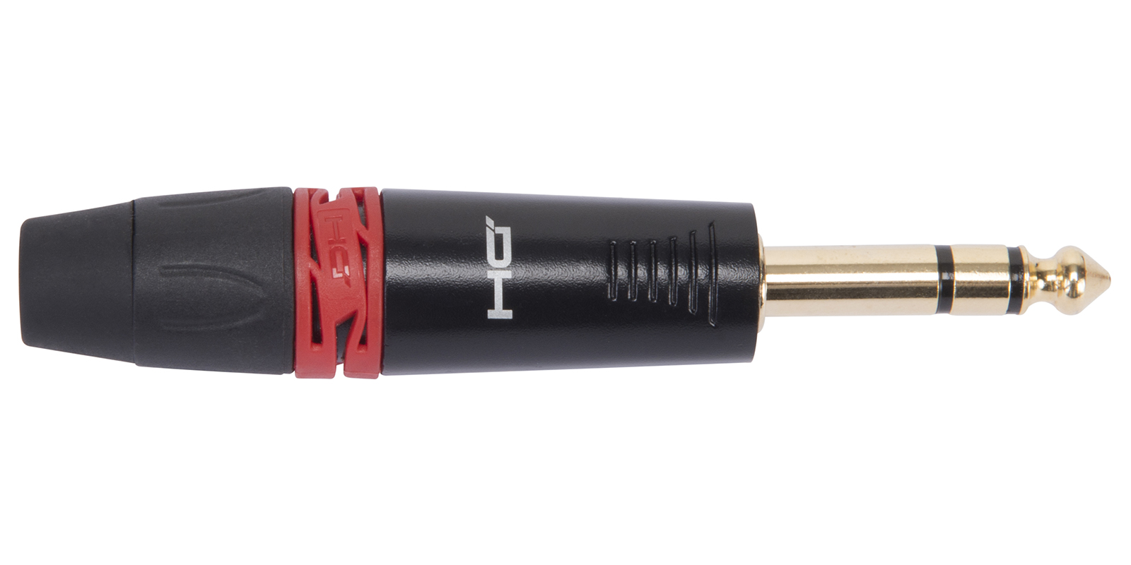 Conector jack estéreo profesional de 6.3 mm, fabricado con aleación de zinc y punta de latón con placa dorada, carcasa trasera de nylon reforzado y funda de PVC, terminado en color negro, incluye anillos en color negro, gris y rojo.