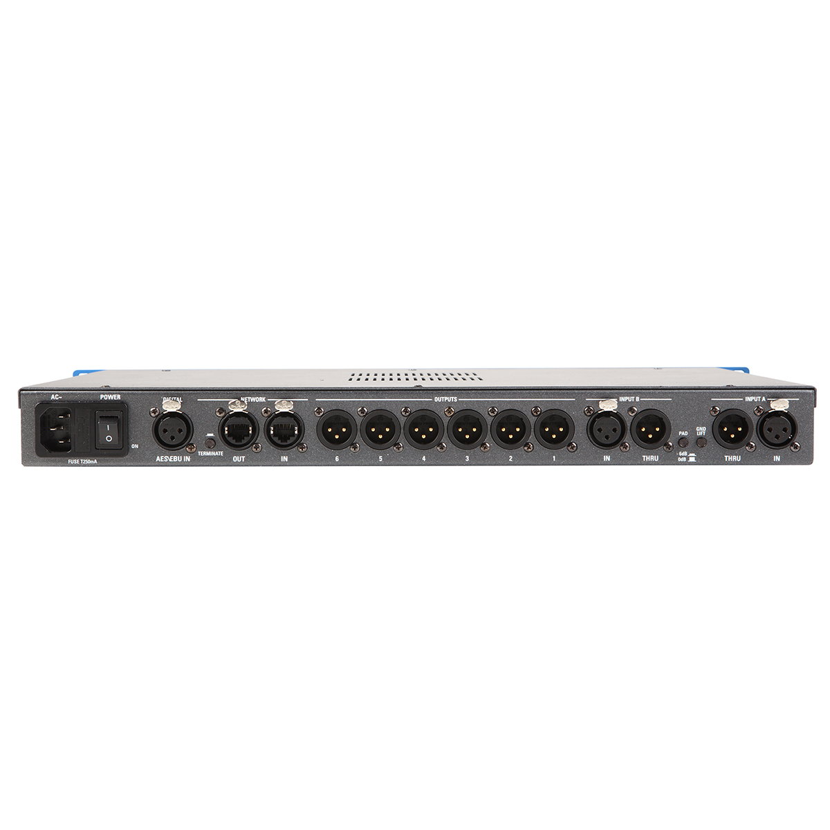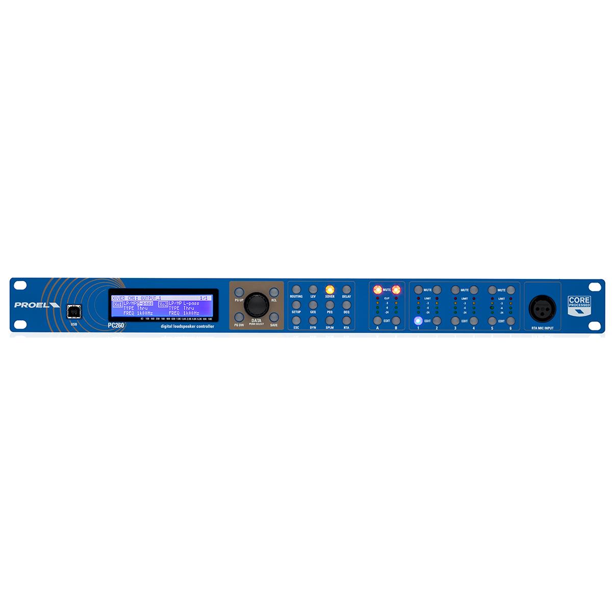 El controlador digital de altavoz PC260 está basado en la plataforma CORE DSP y el su característica avanzada es el procesamiento de la señal, funciones avanzadas y una interfaz de usuario intuitiva con acceso directo a todas las funciones de edición y capacidad de control remoto. La resolución de 40 bits de punto flotante y la conversión AD/DA de 24 bits garantizan una perfecta integridad de la señal con un rango dinámico superior a 110 dB, para lograr una calidad sonora superior. El PC260 incluye un conjunto completo de funciones y tiene 2 entradas (con la opción de entrada digital AES) y 6 salidas. Cada entrada cuenta con ecualizador paramétrico completo de 5 bandas (incluyendo paramétrico, shelving, notch, res, HP y LP, allpass y bandpass), ecualizador gráfico de 28 bandas y 3 bandas de un extremadamente versátil y poderoso ecualizador dinámico. Un compresor / limitador completamente programable y hasta 600 ms de retraso también están disponibles. Las salidas incluyen cualquier tipo de filtros de crossover con una inclinación de hasta 48 dB por octava, junto con 5 bandas de PEQ. Las características adicionales incluyen 1/3 oct RTA con entrada de micrófono dedicada con potencia phantom y función de agrupación. El SPL Manager específicamente diseñado para la aplicación en instalaciones fijas, es una herramienta muy potente que permite programar en 4 escenas diferentes 16 eventos en cada entrada y salida, incluyendo MUTE, cambio de nivel, cambio de compresor threshold y cambio de preset. Estos eventos se pueden realizar de forma automática de acuerdo con el reloj interno de la unidad. El PC260 puede ser controlado de forma remota con software PRONET a través del puerto USB en el panel frontal y se puede incluir en una red PRONET utilizando dos conectores RJ45 en la parte trasera del panel (con el convertidor USB2CAN opcional).