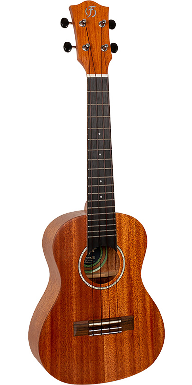 Ukelele concierto, tapa de caoba sólida, aros y fondo de caoba laminada, puente de madera púrpura, brazo de okoume, diapasón de madera púrpura, cejuela y montura de hueso, ancho de la cejuela: 35 mm, 18 trastes, pastilla activa con controles de tono, marcadores de posición en los trastes 5, 7, 10 y 12, roseta perla, puntos laterales, incluye funda acolchada y un paquete de stickers.