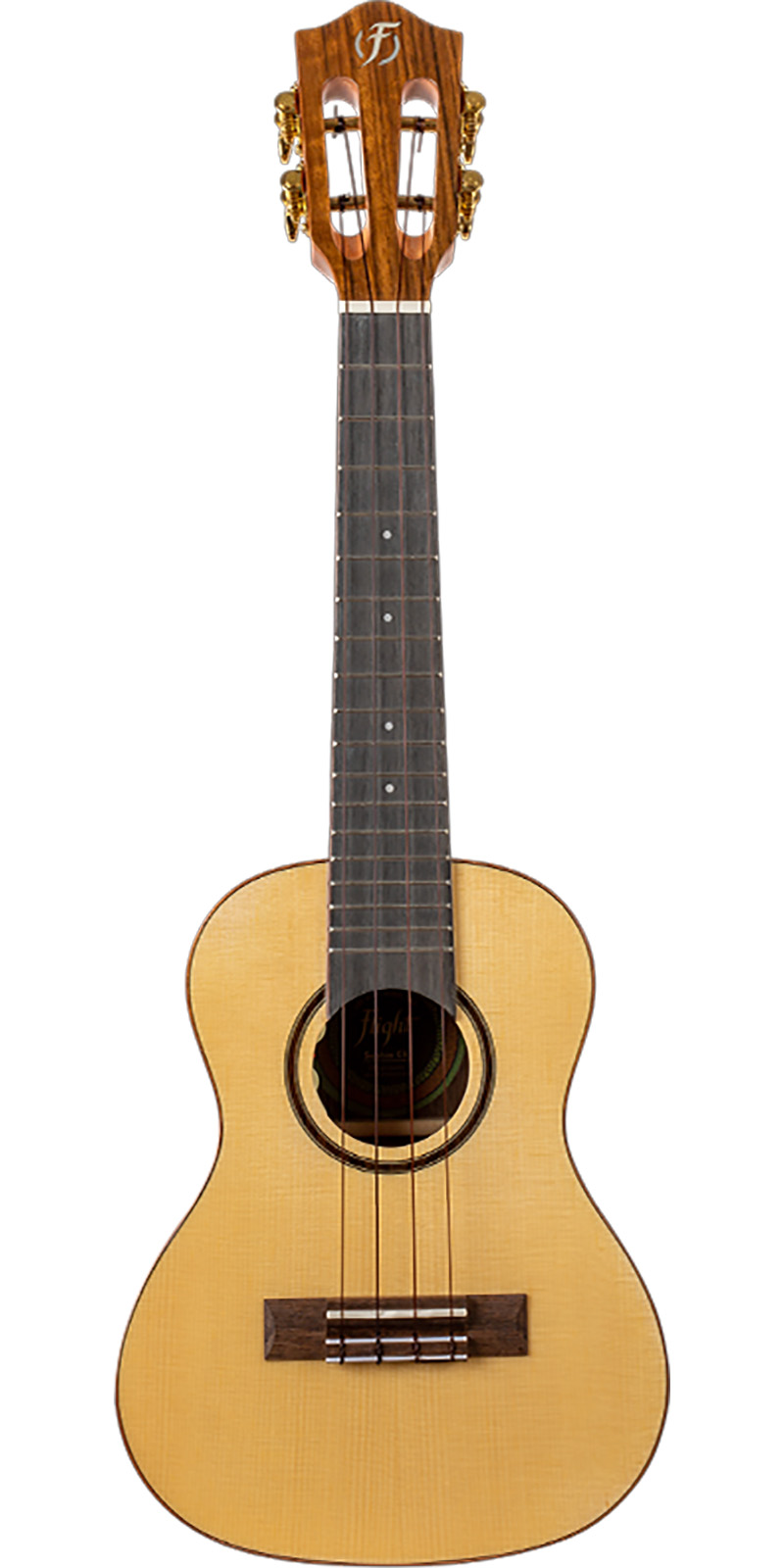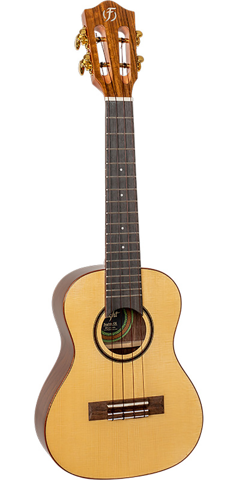 Abeto y nogal. El abeto es una madera adorada por quienes tocan el ukelele debido a su proyección abierta y su volumen. Esta tapa de abeto completamente sólida se combina con una hermosa madera laminada de nogal para agregar un aspecto más cálido y un sonido similar al del palo de rosa. La unión de estas dos maderas proporciona un tono profundo y una resonancia impresionante. Justo cuando pensabas que no podría ser más celestial con el magnífico contraste de las dos maderas, el brillo de todo el cuerpo hace que este ukelele sea un verdadero afinador.
