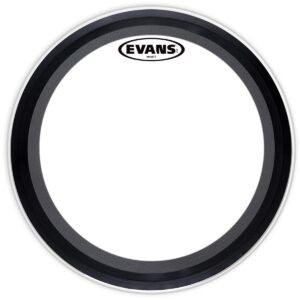 Parche de golpe para bombo de 24” pulgadas, serie EMAD2 Clear, fabricado con doscapas de película, una externa de 7 milésimas de pulgada y una interna de 10 milésimas de pulgada, sistema EMAD de sordina externa que disminuye los armónicosy el sustain, dando un sonido seco y grave, mayor resistencia, hecho en USA.