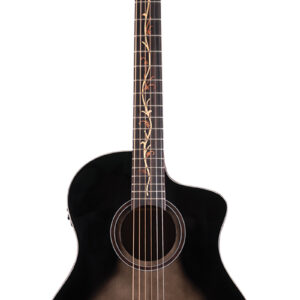 Guitarra acústica Studio de 6 cuerdas con resaque, sonido enfocado y sensación muy cómoda, tapa de abeto seleccionado, aros y fondo de nogal figurado, refuerzo de cuarto aserrado escalopado, roseta Washburn Bella Tono, sistema de preamp Barcus Berry LX4, color Gloss Charcoal Burst, brazo de okoume, diapasón de ébano, 22 trastes, incrustaciones: vine, escala: 25.5”, hardware negro, puente de ébano, maquinaria negra diecast.