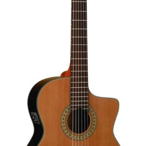 Guitarra electro-acústica con cuerpo clásico, tapa de abeto sólido, aros y fondode caoba, refuerzo de abeto festoneado, roseta: mosaico, brazo de caoba, diapasón de palo de rosa con 19 trastes, sin incrustaciones, cejuela de graphtech de 52 mm de ancho, escala: 25.5, preamp BBand A3T, puente de palo de rosa, maquinaria dorada clásica, cuerdas D’addario EJ46 ProArte, tensión dura.