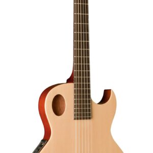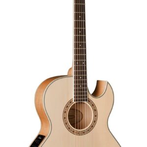 Guitarra electro-acústica thin jumbo, cutaway, tapa de abeto sitka sólido, arosy fondo de maple flameado, refuerzo de abeto festoneado, roseta de madera, brazode maple satinado con alma de 2 vías, diapasón de palo de rosa, 20 trastes, incrustaciones: puntos, cejuela de hueso de 43 mm de ancho, escala: 25.5, preamp Fishman Presys+, puente de palo de rosa, maquinaria diecast dorada, cuerdas D’Addario EXP-16 light set phospher bronze.