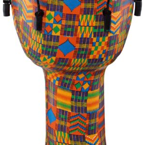 Djembe con parche y carcasa sintéticos, diámetro de 12” pulgadas, altura de 24” pulgadas, perfecto para tocar al aire libre, ultraligero y fácil de transportar, cuerdas de nylon HTP pre estiradas, produce slaps agudos y tonos graves profundos, fondo de goma antideslizante para proteger también el tambor de arañazos, cuerda de 4 mm de espesor, corredores de cuerda de 25 mm, diseño Kenyan Quilt.