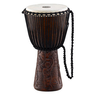 Djembe Meinl. Modelo: PROADJ2-L. Fabricado con madera de caoba en una sola piezaescarbada a mano. Resistente malla de nylon. Parche de cuero de cabra. Grabadodecorativo estilo aldea.