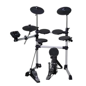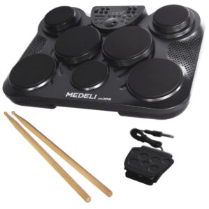Batería digital Medeli con 3 pads de tambor, 1 pad de tarola con función dual zone, 3 pads de platillos, pedal de control de Hi-Hats y pedal de bombo. 108 sonidos. 10 kits predeterminados. 40 canciones. Puerto USB, salida MIDI y auxiliar.