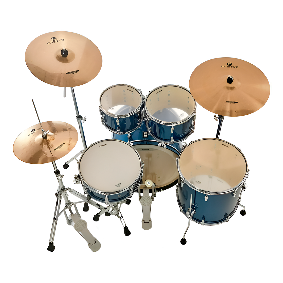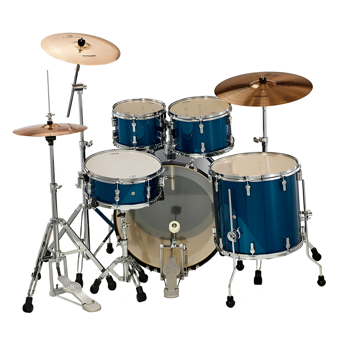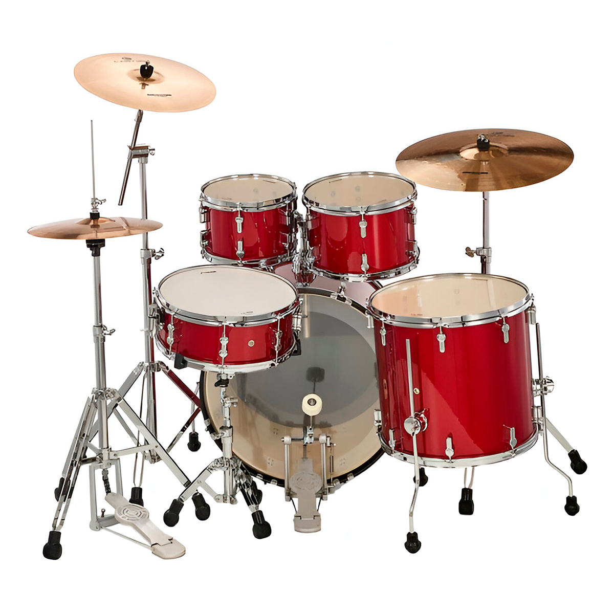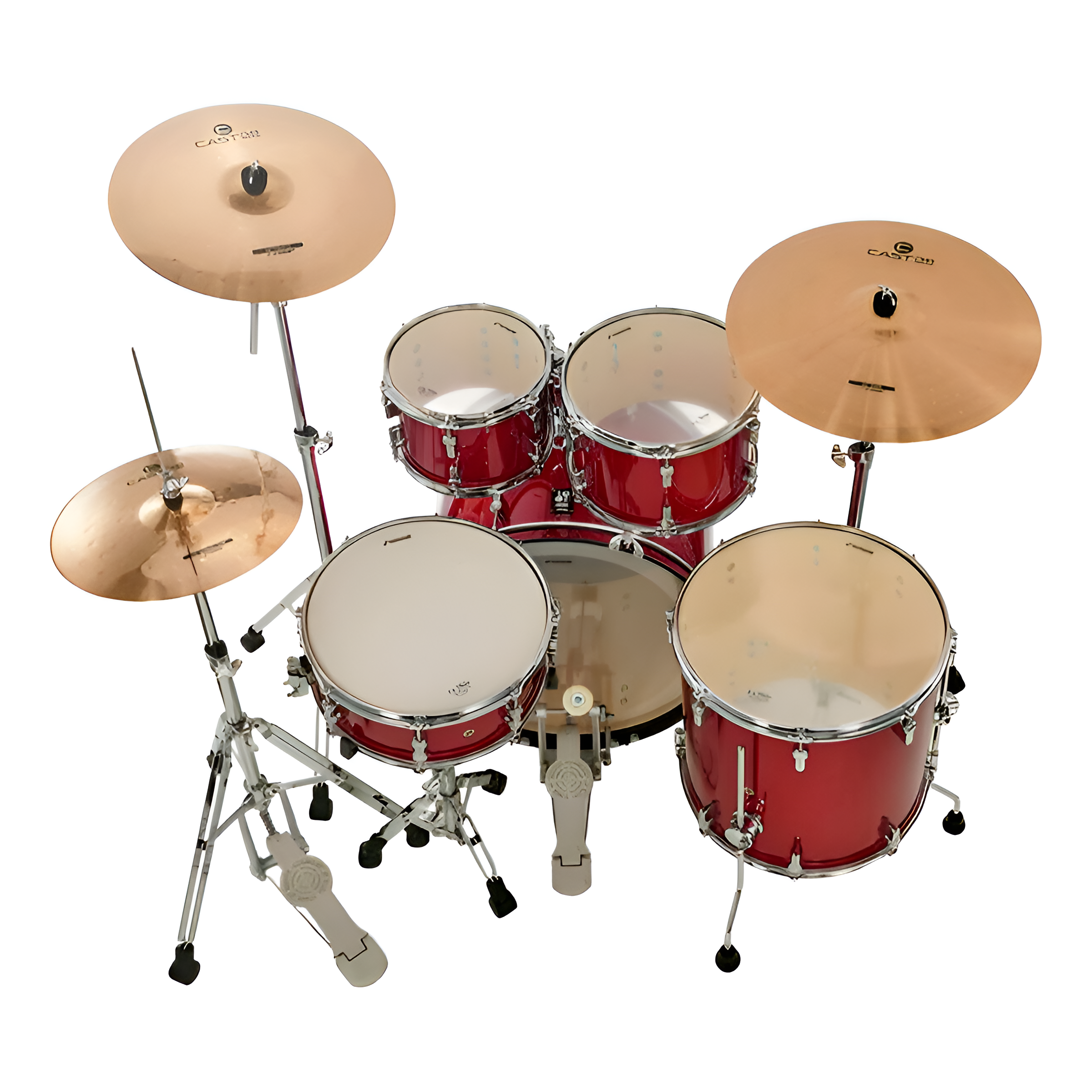 Bombo de 22×16“ Toms de aire de 10×7” y 12×8“. Tom de piso de 16×15“. Tarola de 14×5.5“.