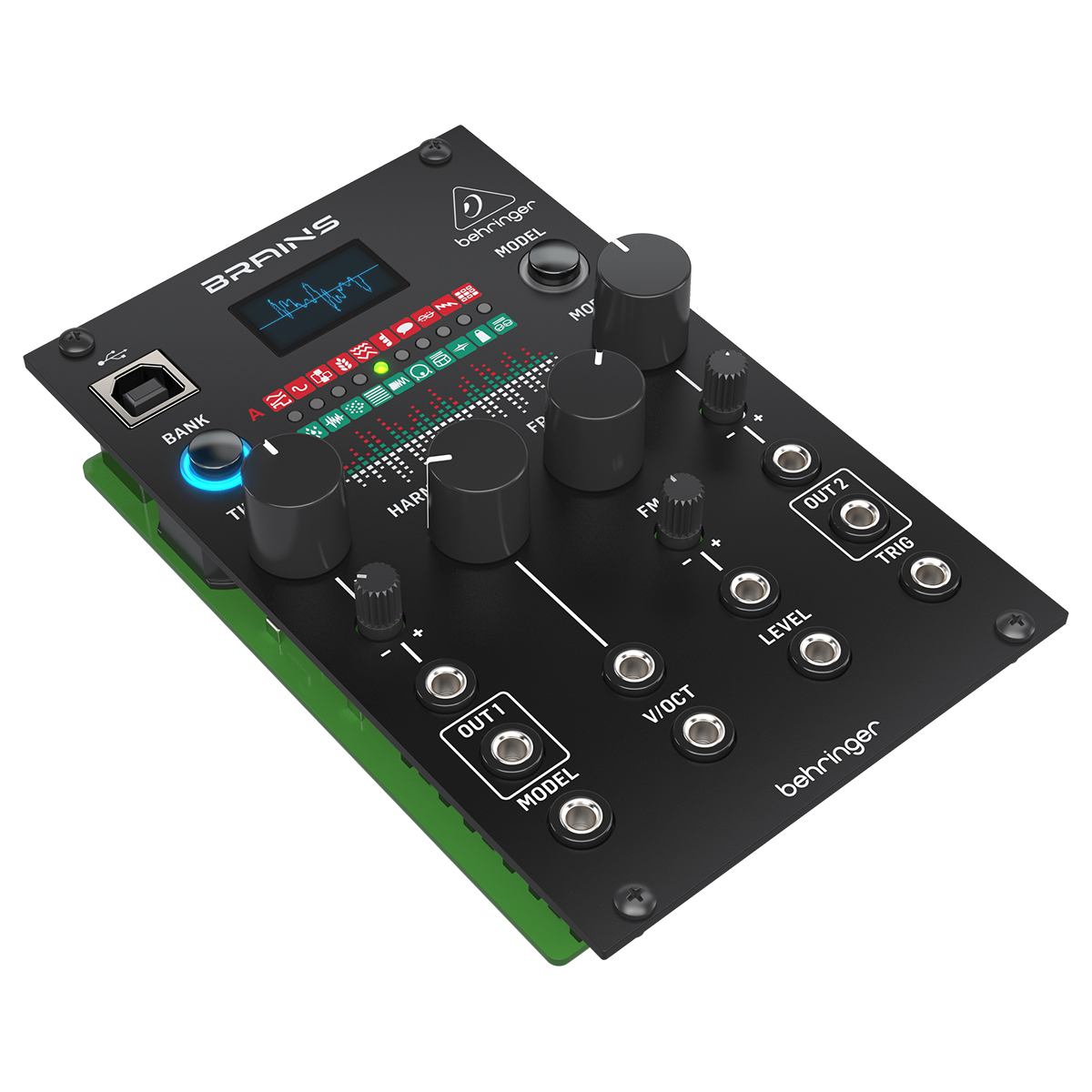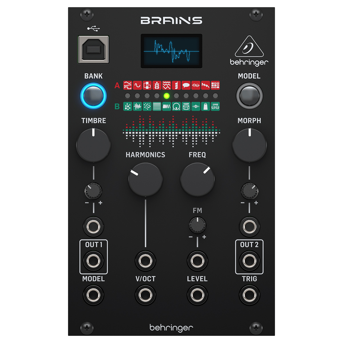 BRAINS de Behringer es una fuente de sonido digital increíblemente versátil para crear sonidos de percusión, leads y basses así como baterías, drones y soundscapes. Con 20 modos de oscilador digital, que incluyen muchos motores de control diferentes, tiene una gran cantidad de sonidos y timbres diferentes para crear algunos parches salvajes y fuera de este mundo usando acordes, oscilación armónica, ruido de partículas, bombo analógico, tarola, Hi-Hat e incluso discurso. BRAINS viene con controles multifuncionales de Timbre, Harmonics, Frequency y Morph que se pueden usar para ajustar cada uno de los 20 modelos de sintetizador. Simplemente selecciona el modo de sintetizador activo con el botón de modelo y luego comienza a girar los controles para cambiar el carácter de tu fuente de sonido hasta que obtengas el tono deseado. Configura cualquiera de los 20 sintetizadores o motores de percusión y ruido de BRAINS, como Virtual Analog, Waveshaper, FM, Grains, Rain, Noise, Dust, Modal Strings, Bass, Snare o Hi Hat para generar ritmos oscuros y pulsantes, tonos brillantes y especiados, acordes exuberantes o pads etéreos para darle vida a tu música. Si tener 20 modos de oscilador no fuera lo suficientemente bueno, BRAINS tiene una pantalla OLED integrada e inspiradora para que puedas visualizar y ajustar las formas de onda exactamente como quieres que sean. Además, tener una pantalla con formas de onda danzantes en tu sintetizador es simplemente increíble. Junto con sus módulos de sintetizador increíblemente modificables, BRAINS también viene con una gran cantidad de conectores de entrada de 3.5 mm para canalizar voltajes de control que amplían las capacidades de BRAINS. También hay disponibles dos salidas de audio separadas para tu sonido principal y una variante dinámica que se puede enrutar a otros módulos para crear sonidos estéreo aún más interesantes y a menudo amplios. BRAINS está diseñado para caber en un estuche Eurorack estándar. Simplemente conecta los cables de alimentación a la fuente de alimentación y monta el módulo con los tornillos incluidos. Esto permite que los BRAINS se mezclan con otros módulos de sintetizados para una configuración verdaderamente única. Usa tus BRAINS ya sea que te estés iniciando en los sintetizadores modulares o estés buscando completar tu colección. Este módulo de Behringer es una gran herramienta para tener en tu arsenal cuando creas música increíble.